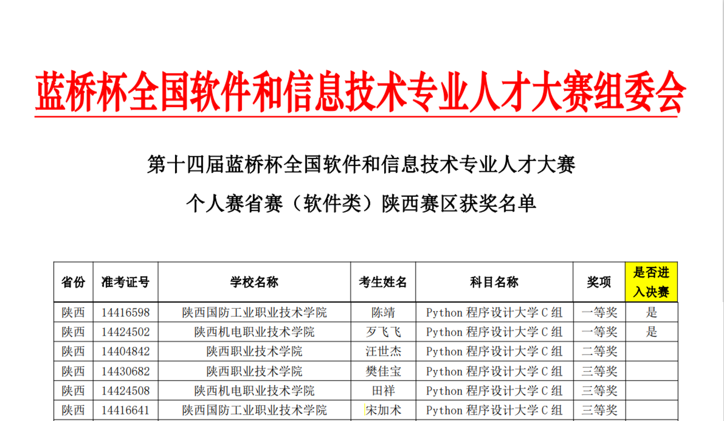 在李纪鑫、赫磊等教师的指导下,我校Java软件开发类C组(高职组)学生以陕西省一等奖1项、三等奖2项的好成绩晋级决赛;在陈晓慧、孙博等教师的指导下,我校python程序设计类C组(高职组)学生以陕西省一等奖1项、三等奖1项的好成绩晋级决赛。