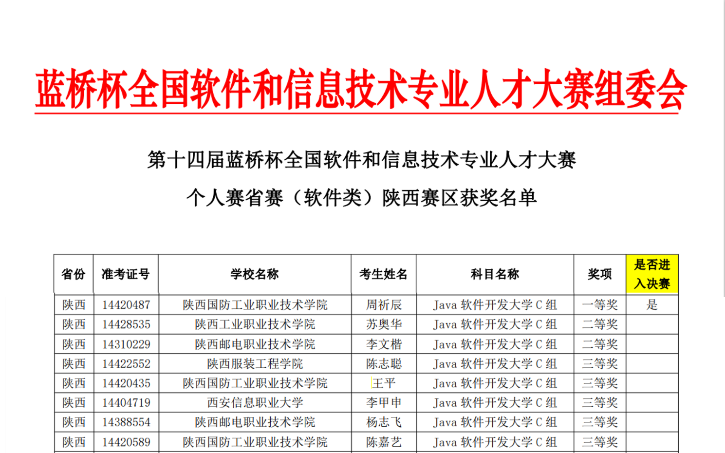 近日,陕西省第十四届蓝桥杯全国软件和信息技术专业人才大赛顺利结束,我校学生在比赛中获得一等奖2项,三等奖3项。