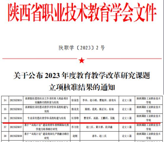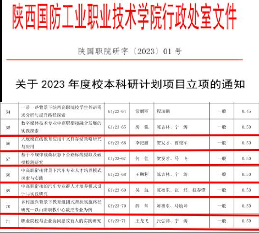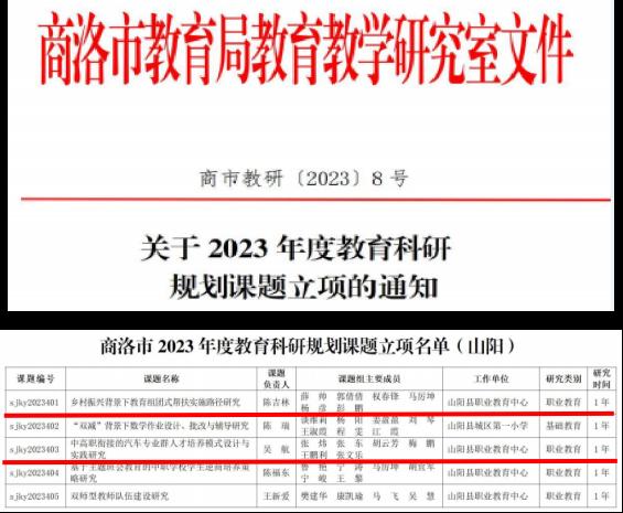 在帮扶团队及山阳职中教师的共同努力下,近半年来,双方主持或参与申请多项课题研究,联合申请陕西省职教学会《专业课程思政教学体系构建与实践》课题1项,商洛市教育规划课题《中高职衔接的汽车专业群人才培养模式设计与实践研究》1项、商洛市教育规划课题《乡村振兴背景下教育组团式帮扶实施路径研究》1项,申请校级课题7项和课程思政示范课课题1项,参与申请山阳职中课题11项,同时,双方还在积极探索省级规划课题等,科研成果丰硕。以上申报的课题研究,山阳职中参与教师达到43人次,带动了山阳职中教师申报课题的积极性,山阳职中科研事业展现出前所未有的发展动力。