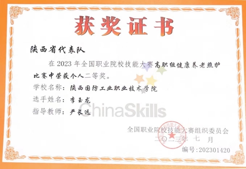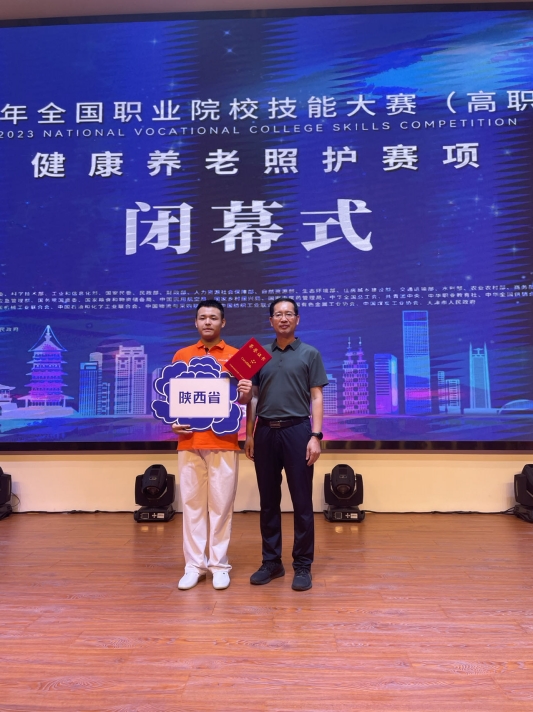 7月21日至22日,2023年全国职业院校技能大赛健康养老照护赛项在洛阳职业技术学院举行,共有来自全国30个省、市、自治区的61名选手参加本次比赛。经过两天的激烈角逐,我校经济管理学院教师严长远指导的学生李玉龙代表陕西省斩获国赛二等奖,取得西北五省高职院校的最好成绩。