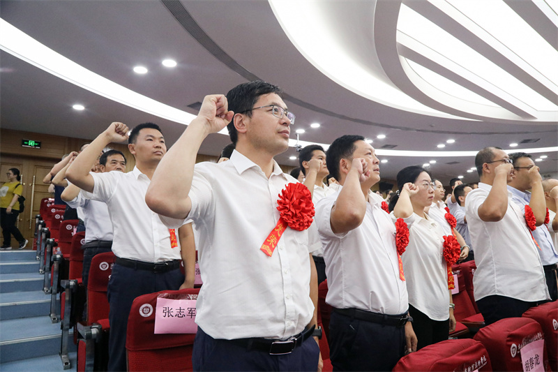 党委书记张卫平讲话,他强调,面对高等职业教育高质量发展的客观要求和学校“双高”建设的发展任务,面对全体师生、家长以及社会各界对学校发展进步的热切期盼,我们迫切地需要把思想统一在学校发展上、信心坚定在学校发展上、力量凝聚在学校发展上、行动聚焦到学校发展上、奋斗持续在学校发展上。他向全校教职工提出三点希望:一是提高政治站位,践行“为党育人、为国育才”使命;二是涵养品行,树立良好师表形象;三是敬业奉献,助力学校高质量发展。