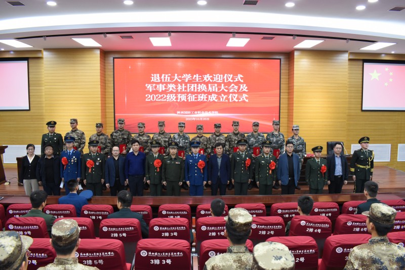 10月26日下午,我校在北校区学术报告厅举行退伍大学生欢迎仪式、军事类社团换届大会及2022级预征班成立仪式。校长刘敏涵、鄠邑区常委、鄠邑区人民武装部负责人、鄠邑区退役军人事务局负责人、校武装部负责人、学生处负责人、校团委负责人、征兵工作站负责老师、退伍大学生代表、军魂学社全体成员、国旗护卫队全体队员、预征班全体学员参加会议。大会由武装部部长徐哲主持。