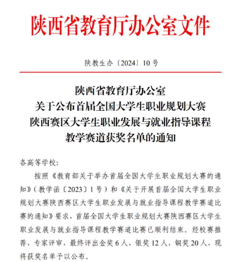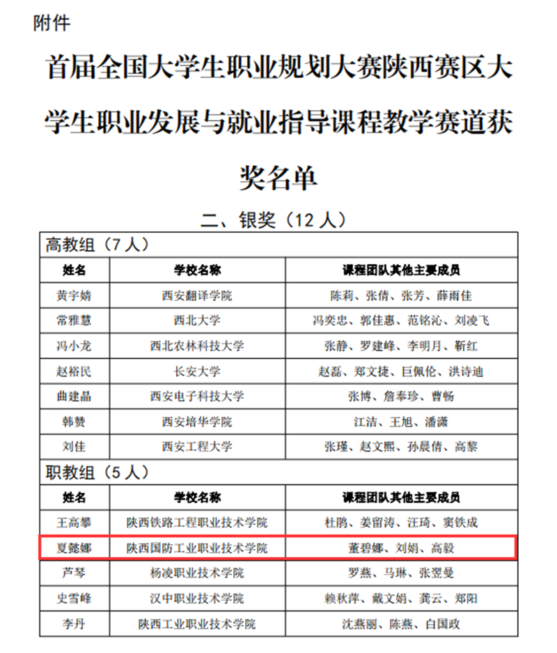 近日,陕西省教育厅公布了首届全国大学生职业规划大赛陕西赛区大学生职业发展与就业指导课程教学赛道获奖名单。经校赛推荐、专家评审,我校马克思主义学院教师夏懿娜及其课程团队成员荣获省赛银奖。