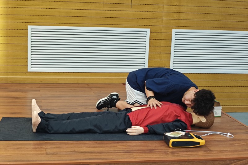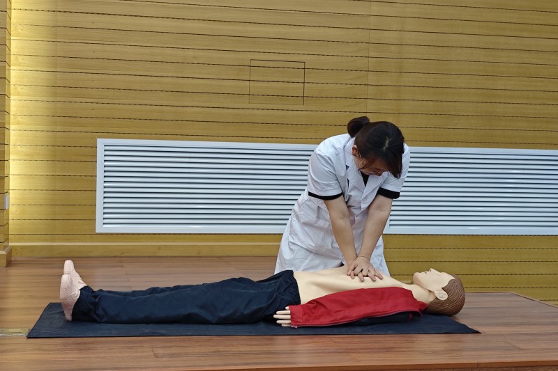 此次培训中,赵茹老师对校园及生活中遇到的突发情况的处置进行了详细讲解,分享了实际救护技巧以及常见外伤的急救措施。师生们积极互动,专注学习急救技巧。随后校医务所两名省红十字会急救培训讲师,利用模拟人在现场分步骤、慢动作演示并讲解了如何判断呼吸、调整体位、胸外心脏按压、打开气道、人工呼吸等急救法。全过程模拟了从伤员突然倒地不醒到120到来的整体施救全过程。演示之后,邀请部分师生进行现场模拟胸外心脏按压操作,老师和学生们积极参与。三名急救培训讲师耐心指导,手把手地为每一位参与演练的师生纠正动作。经过一番培训后,师生们完成模拟了单人徒手心肺复苏和双人心肺复苏配合使用AED。基本掌握了心肺复苏的关键要领和AED的使用方法。