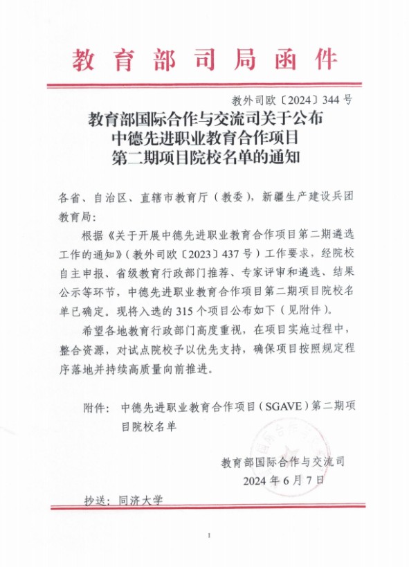 6月7日,教育部国际交流与合作司发布了关于《中德先进职业教育合作项目(SGAVE)第二期项目院校名单的通知》,我校汽车检测与维修技术、机电一体化技术2个专业名列其中。