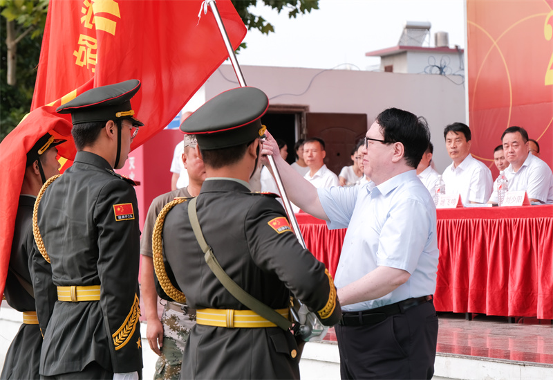 校党委书记全卫强给军训团授旗。军训团参谋长张楠给各营授旗