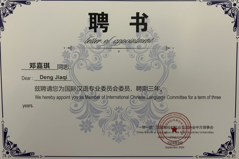 此外,我校加入了中国-乌兹别克斯坦职业教育联盟并任副理事长单位,成为中巴国际产教合作联盟发起单位,加入了丝路文化交流发展联盟。我校国际中文教师邓嘉琪受聘为“一带一路”国家院校和企业交流协会中方理事会-国际汉语专业委员会委员。