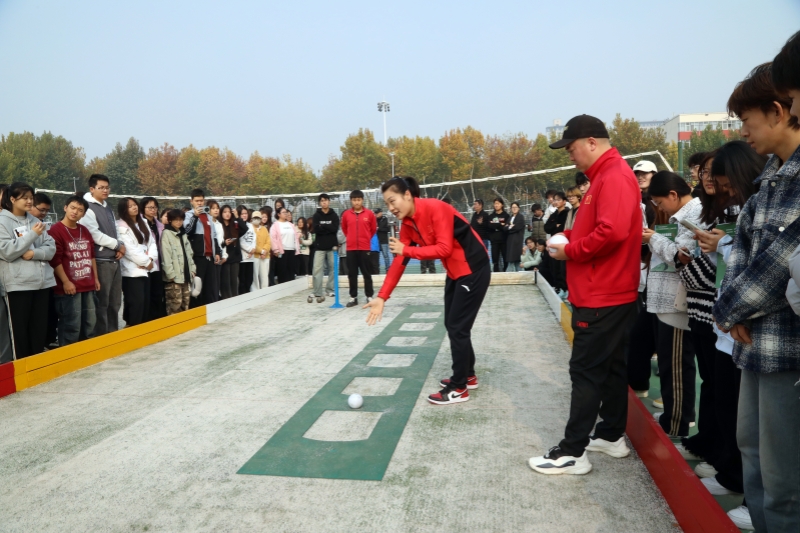 中国掷球协会竞赛与裁判专委会委员、陕西省掷球协会秘书长刘转为全体师生介绍了出席本次活动的掷球冠军选手,同时讲述了掷球运动的发展历史,并对掷球运动的六个子项目进行了详细介绍。