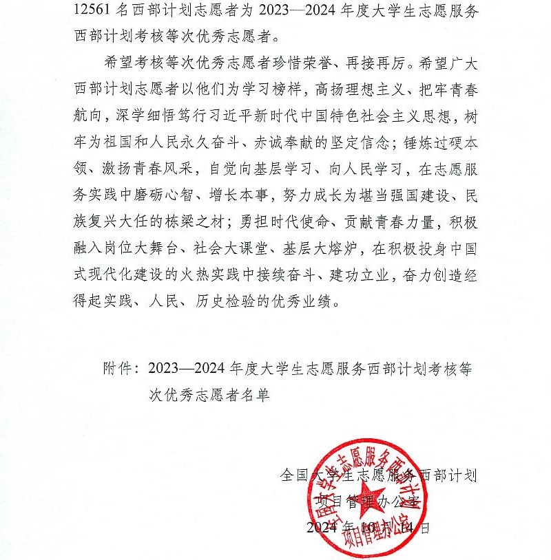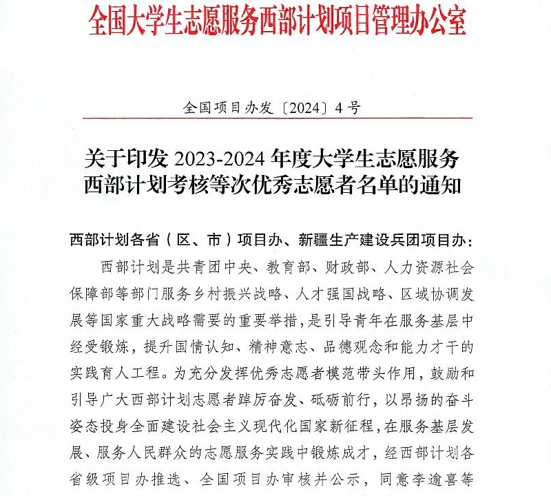 根据全国大学生志愿服务西部计划项目管理办公室《关于印发2023-2024年度大学生志愿服务西部计划考核等次优秀志愿者名单的通知》(全国项目办发﹝2024﹞4号),我校共有4名西部计划志愿者获评为全国西部计划考核等次优秀志愿者。