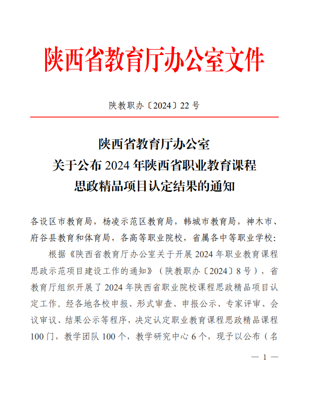 11月21日,陕西省教育厅办公室公布了《陕西省教育厅办公室关于2024年陕西省职业教育课程思政精品项目认定结果的通知》(陕教职办〔2024〕22号),学校《特种加工技术》等4门课程入选陕西省职业教育课程思政精品项目。