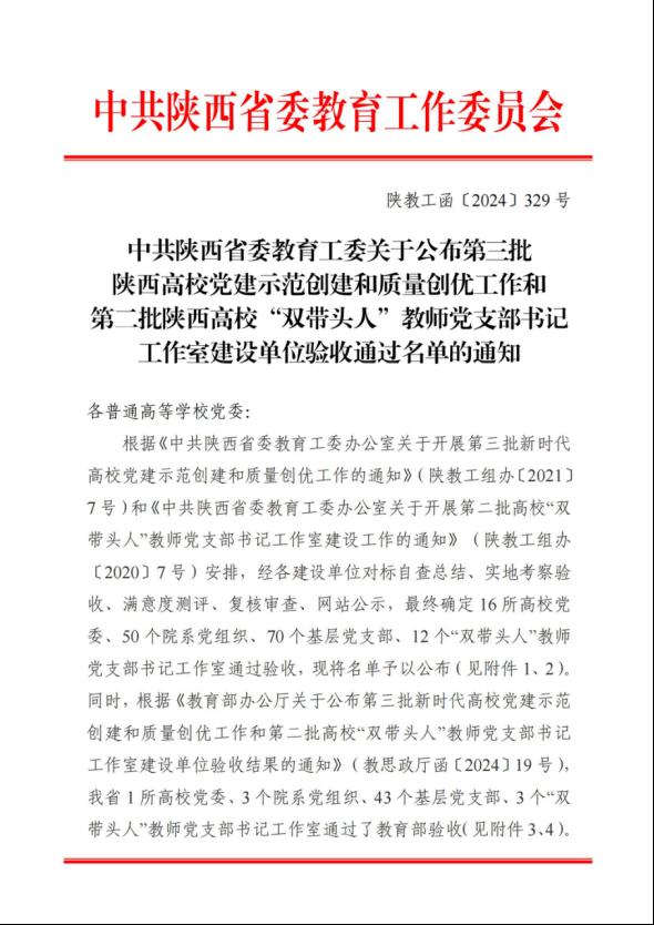 11月16日,省委教育工委公布了第三批陕西高校党建示范创建和质量创优工作验收结果,我校电子信息学院数字通信教师党支部顺利通过第三批全国高校党建工作“样板支部”培育创建验收,校党委、人工智能学院党总支、计算机与软件学院第一学生党支部顺利通过第三批全省高校党建工作“示范高校”“标杆院系”“样板支部”培育创建验收。