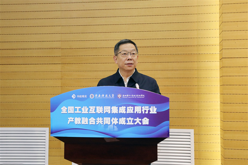 陕西科技大学副校长费贵强致辞。他表示,陕西科技大学作为本次共同体的主要发起单位之一,将充分发挥自身在人工智能与工业互联网领域的学科优势和人才优势,深化产教融合,推动教育链、人才链、产业链、创新链“四链”合一,加强产学研用各方的紧密合作,搭建一个开放包容、合作共赢的平台,促进技术突破和应用创新,积极推动共同体的建设和发展,为我国工业互联网的高质量发展贡献智慧和力量。同时,也期待与各位领导和嘉宾深入交流、共同探讨,共同推动全国工业互联网集成应用行业产教融合共同体的发展,未来,陕西科技大学将继续秉承“厚德博学、笃行至善”的校训精神,为我国工业互联网产业的发展注入新的活力。