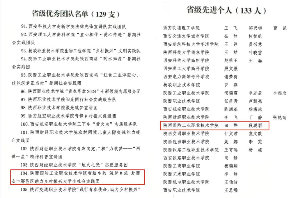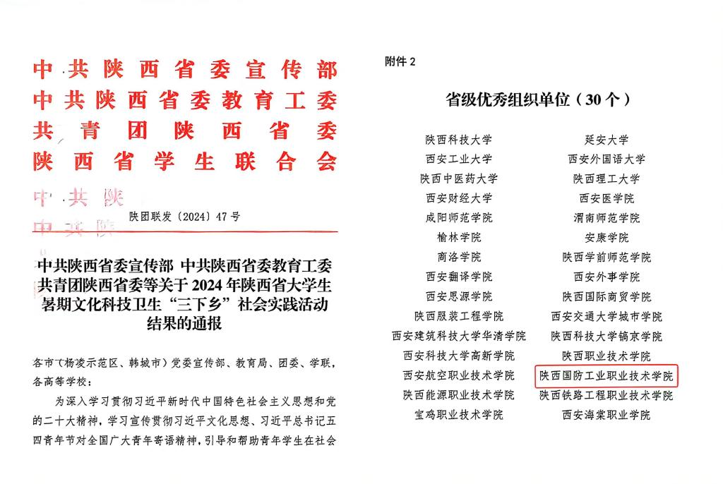 12月5日,中共陕西省委宣传部、中共陕西省委教育工委、共青团陕西省委等下发《关于2024年陕西省大学生暑期文化科技卫生“三下乡”社会实践活动的结果通报》。我校荣获2024年大学生暑期“三下乡”活动省级“优秀组织单位”,“智绘乡韵 筑梦乡旅”赴西安市鄠邑区助力乡村振兴大学生社会实践团荣获“省级优秀团队”,教师田烨、段聪影荣获省级“先进个人”。