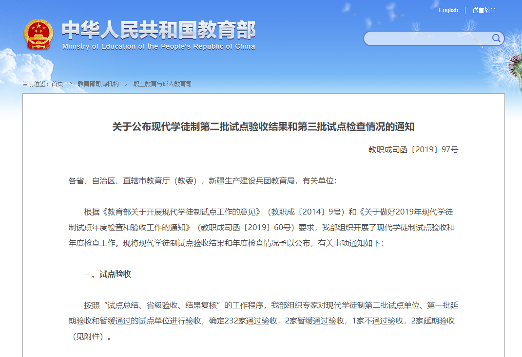 10月24日,教育部职业教育与成人教育司发布《关于公布现代学徒制第二批试点验收结果和第二批试点检查情况的通知》(教职成函〔2019〕97号),我校汽车检测与维修技术专业(戴姆勒铸星教育)顺利通过了教育部对现代学徒制第二批试点单位的验收。