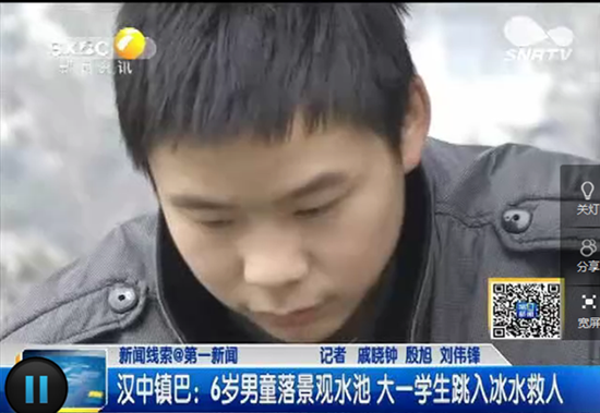 近日,betway必威中文正版大一学生文光明冒着严寒在镇巴县苗乡广场凉亭的水池中救起了一个素不相识的落水的小男孩。