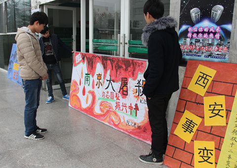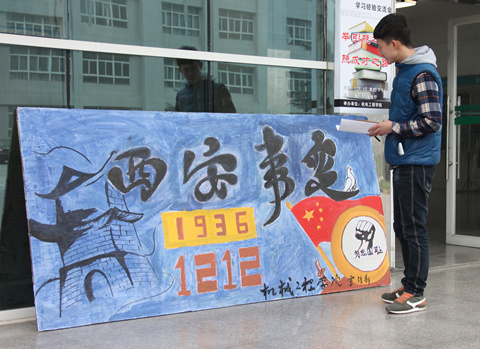 2015年12月12日是西安事变79周年纪念日,校记者协会、各分院学生会一同在教二教三大厅门口展出了关于“西安事变”的手绘文化展板,吸引了过往的众多师生瞩目。不仅向同学们展示了中国永不泯灭的精神,同时也激励了同学们的爱国情怀。