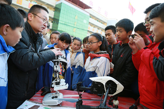 在开幕式上,我校电子教研室主任屈宝鹏老师代表学校领导对本届文化艺术节、科技节的举办致以热烈祝贺。随后,我校航模队进行了精彩的飞行表演,也为在场的中学生进行了相关科技知识的讲解和无人机的介绍。