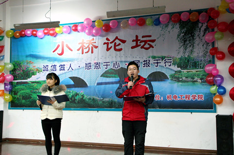 为进一步推进大学生思想政治教育,引导学生塑造诚信品质,树立感恩意识。12月11日下午,机电工程学院在北校区教二131教室成功举办题为“诚信做人、感恩于心、回报于行”的第25期“小桥论坛”活动。学院党委书记张文斌教授出席活动,院团委书记李俊涛、数控学院党总支书记张俊勇、汽车学院党总支书记杨小平、机电学院相关老师和近300名学生参加了本次活动。