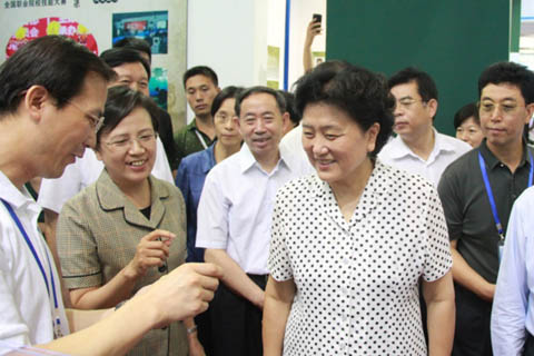 图1中央政治局委员、国务院副总理刘延东,教育部部长袁贵仁,教育部副部长鲁昕等参观2013年全国职业院校技能大赛成果展