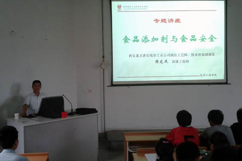 5月30日,应化学工程学院邀请,校企合作工作站企业第845厂(西安北方惠安化学工业有限公司)副总工艺师、技术质量部部长、高级工程师周龙民在我校南校区2-J21为师生作了题为“食品添加剂与食品安全”专题讲座。