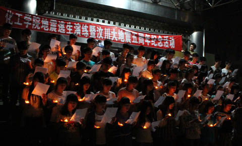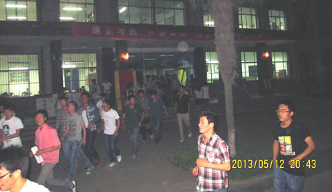 5月12日晚8:45,化学工程学院开展了一次预防地震灾害的逃生演练活动,整个演练过程严格按照预先制定的疏散路线进行疏散,演练快速、有序,达到了预期的效果。演练结束后,化工学院全体师生在南校区信息楼广场举行了“汶川大地震五周年纪念活动”。