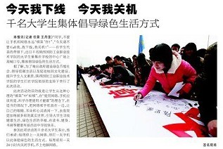 参加此项活动的千余名大学生表示,他们承诺:每周停上一天网络,停打一天手机以此体验绿色的生活方式。每周将有一天24小时内关闭手机,不上电脑网络。
