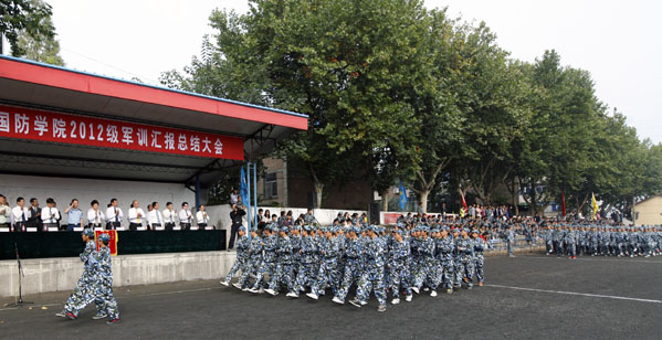 院党委书记张文斌在军训团团长的陪同下检阅了军训方队。我院2012级4000余名新生迈着整齐的步伐、喊着嘹亮的口号、英姿飒爽,气宇轩昂地走过主席台接受领导的检阅。无论是阅兵礼还是分列式,参加军训的新生,充分展示了我院学子的豪迈热情、积极向上的青春风采。军体拳表演更是将汇报表演推向了高潮,赢得了部队首长、学院领导以及现场师生的一致好评和热烈掌声。