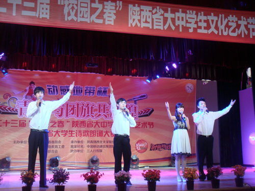 2012年5月至7月,由中共陕西省委教育工委、共青团陕西省委、陕西省学生联合会共同举办的主题为“青春与团旗共辉煌”第二十三届“校园之春”陕西省大学生文化艺术节在西安各大高校隆重举行。学院院团委组织的学生代表队分别参加了本届艺术节的四项比赛,并获得了一个优秀奖和两个三等奖的好成绩。