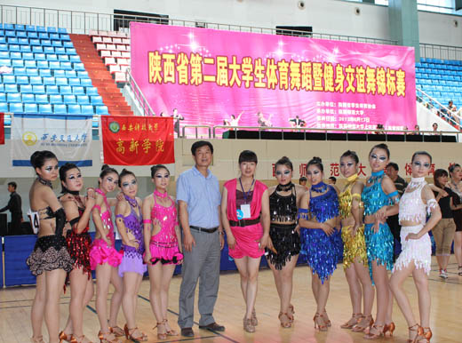 本次大赛来自西安交通大学、西北大学、陕西师范大学、西安体育学院、西安音乐舞蹈学院等22所高校的的576名选手参赛,比赛共设50多个项目。我院代表队于5月28日开始组队集训,共有十名队员参加了十一个项目的比赛。比赛中,我院队员凭借着不凡的实力与丰富的比赛经验,最终荣获拉丁团体舞第一名,任妍妍、徐天琪同学获得恰恰单项第一名、单项伦巴第一名及拉丁两项第二名;郑佳琪、马芬同学获得单项恰恰第二名、单项伦巴第二名;秦媛、马青获得单项恰恰第一名的好成绩。我院代表队教练李娟老师被评为“优秀教练员”的称号。