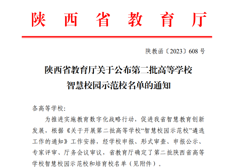 近日,陕西省教育厅印发了《关于公布了第二批高等学校智慧校园示范校名单的通知》,学院荣获“陕西省高等学校智慧校园示范校”,在智慧校园建设方面取得一项新的标志性成果。