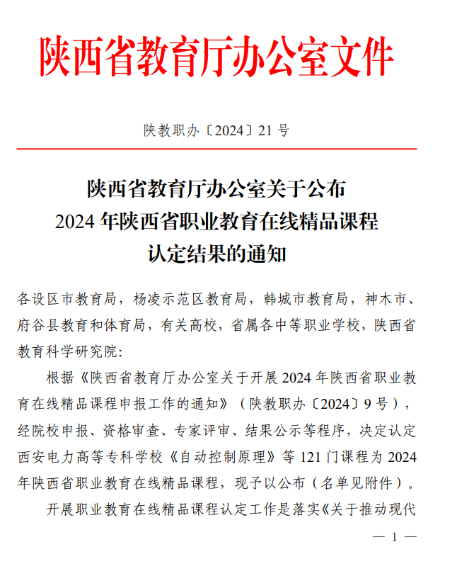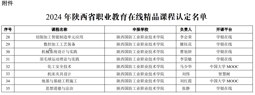 1120日,陕西省教育厅办公室公布了《陕西省教育厅办公室关于2024年陕西省职业教育在线精品课程认定结果的通知》(陕教高办〔202421号),我校推荐的切削加工智能制造单元应用8门课程,全部认定为2024年陕西省职业教育在线精品课程,认定率100%认定总数居全省前列。
