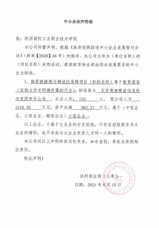 附:北京赛康精益信息技术有限责任公司中小企业声明函