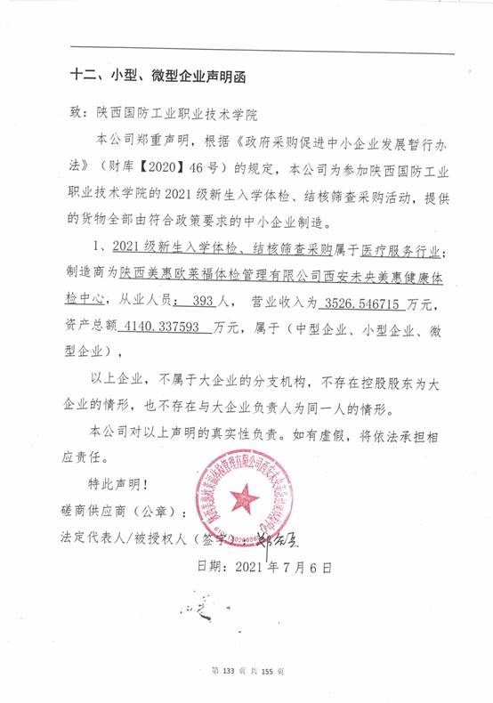 附:陕西美惠欧莱福体检管理有限公司西安未央美惠健康体检中心中小企业声明函