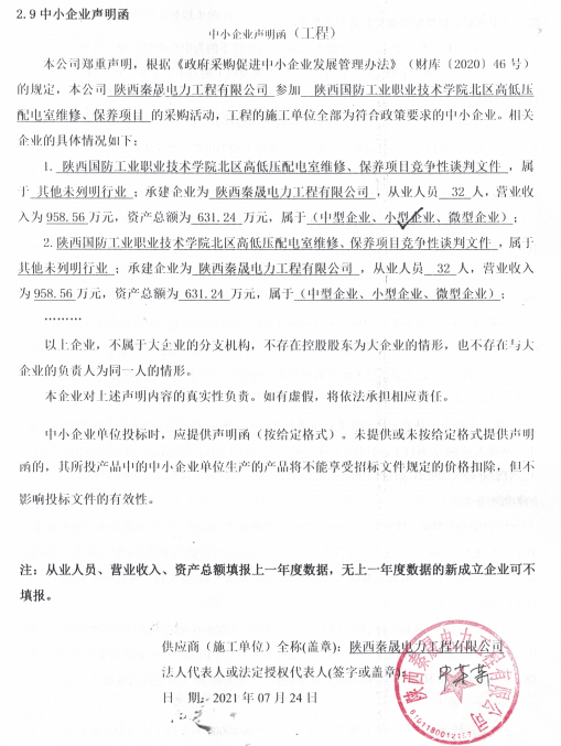 附:陕西秦晟电力工程有限公司小微企业声明函