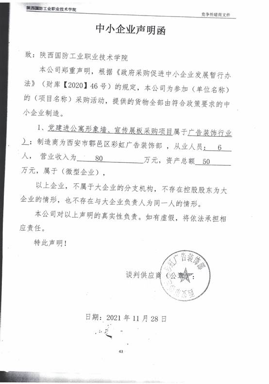 附:西安鄠邑彩虹广告装饰部中小企业声明函
