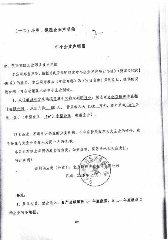 附:北京毓秀博雅翻译有限公司中小企业声明函