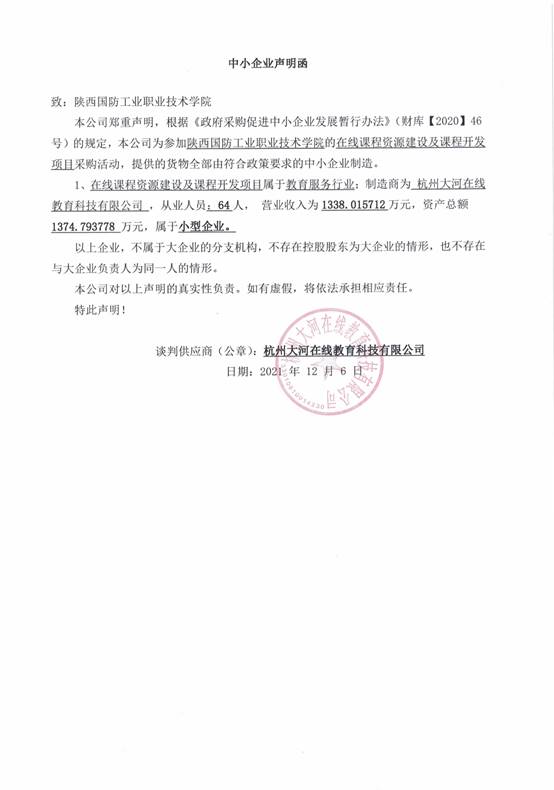 附:杭州大河在线教育科技有限公司中小企业声明函