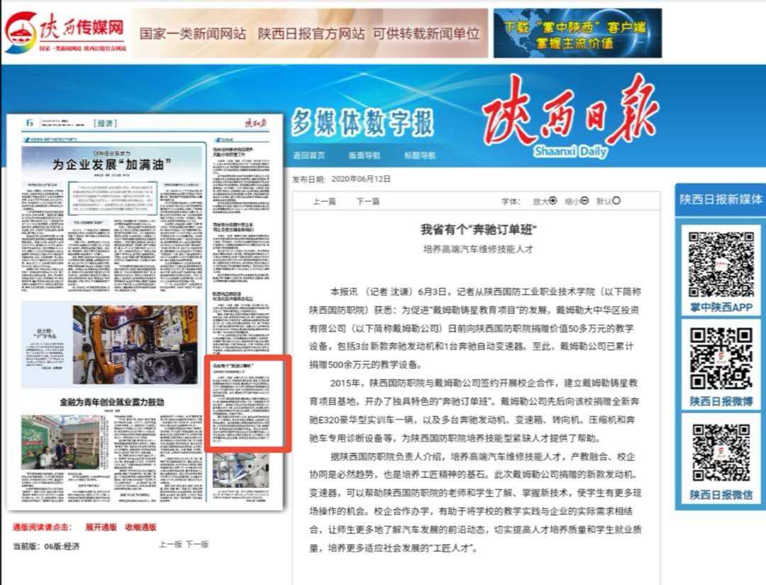 《陕西日报》2020年6月12日(记者 沈谦)题:我省有个“奔驰订单班” 培养高端汽车维修技能人才