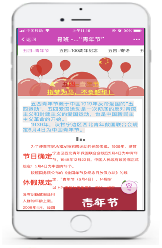 学院易班发展中心坚持“立德树人 服务学生”的理念,一切从学生实际出发、一切为学生服务,通过易班平台帮助学生成长成才。根据节日等一些重要时间节点开发了多个轻应用,如“五四易起过青年节”、“易起过端午”、“我爱我的母亲”、“世界禁烟日”、“防灾减灾日”等,让学生学习到了许多有用的知识,通过易班平台抒发了自己真实的感情;通过易班将学校的评奖评优结果进行公告、宣传,选树典型,发挥同辈榜样影响作用,如“校园十佳学生”先进事迹展示,让更多学生能以这些优秀的“国防学子”为榜样,奋发图强、努力拼搏;根据学生需求开发了具体本校特色的轻应用,如“国防表白墙”、“易起留言(毕业生)”、“校园易点”等,形成了一批具有国防学院特色的课群、活动和