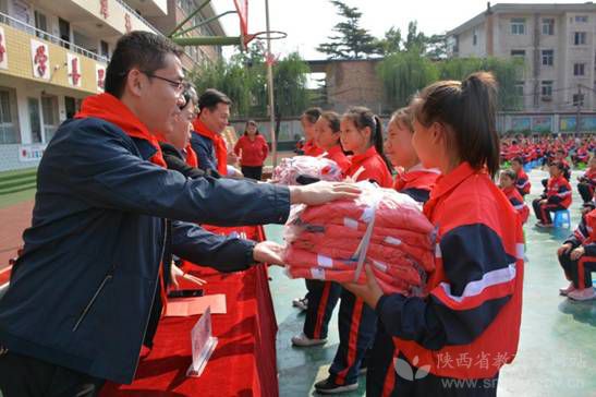 陕西国防职业技术学院教师代表为逸夫小学学生捐赠校服