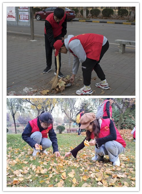 艺术学院学生会、志愿者和部分学生对校园道路两侧的落叶进行清扫,他们并没有把落叶当垃圾清理,而是精心挑选可用落叶,将它们收集起来作为自己创作所需的素材。