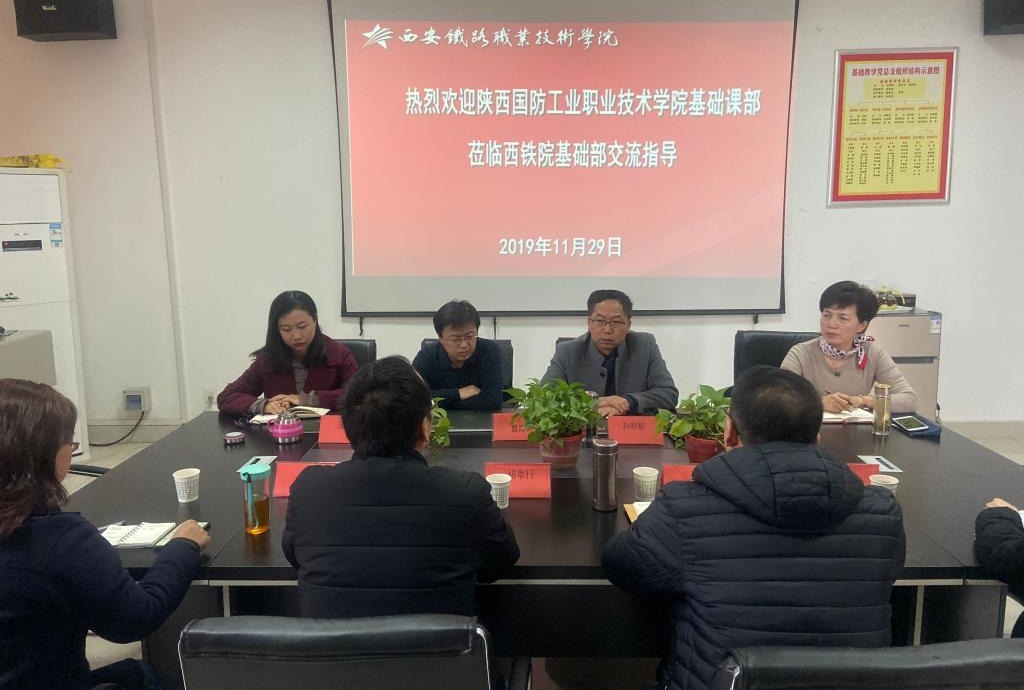 2019年11月29日上午,我校基础课部杨文革主任带领办公室主任杨季行、数理教研室主任杨爱云、语言教研室主任曹李宏等一行四人赴西安铁路职业技术学院交流。西安铁路职业技术学院基础部主任孙明魁、数学教研室主任曹西林、英语教研室主任董淑琴、语文教研室主任潘馨培等参加座谈。