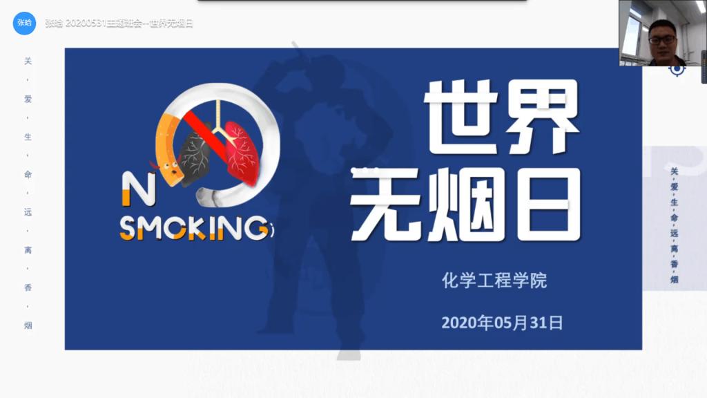 2020年5月31日是第33个世界无烟日,为了让同学们了解到烟草的危害,号召同学们学会珍爱生命、远离香烟,做一名德智体美劳全面发展的大学生,打造清新优美、风气良好、绿色健康的校园环境。5月31日,化学工程学院通过网络视频组织开展了“少一只香烟,多一片蓝天”禁烟控烟主题教育宣传活动。