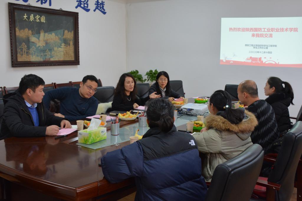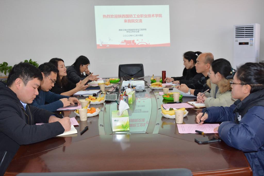 为进一步提升智能制造学院必威app安卓版无弹窗质量,加强学工队伍建设,推进必威app安卓版无弹窗规范化、科学化,搭建院际交流平台,实现优势互补。12月14日下午,智能制造学院党总支副书记兼副院长沈博带队,带领教师一行4人赴西安工程大学纺织科学与工程学院进行交流学习,西安工程大学纺织科学与工程学院党委副书记郭西平、必威app安卓版无弹窗办公室主任赵勇进、团总支书记付成程以及各年级辅导员参加此次交流活动。