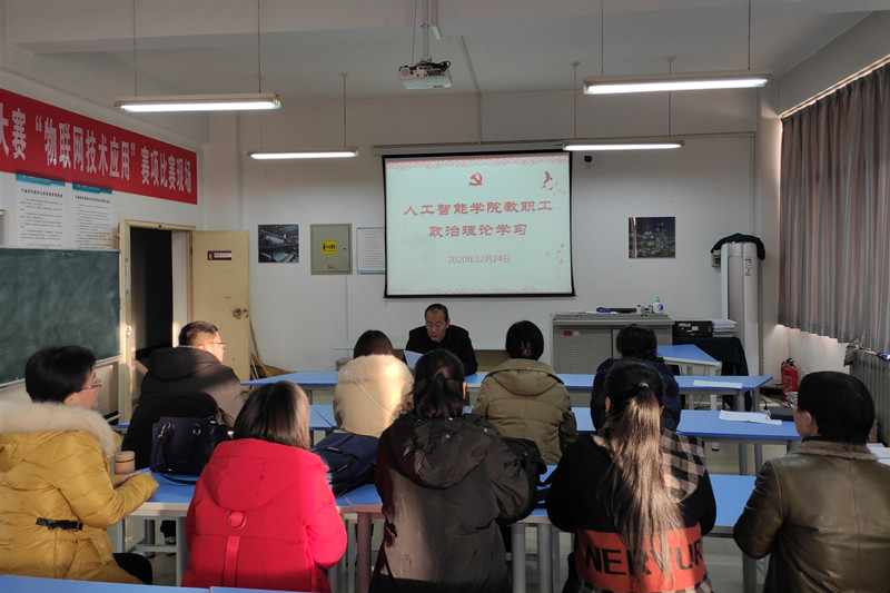 【人工智能党总支】根据陕国职党宣〔2020〕12号《关于2020年12月份组织活动暨教职工政治理论学习安排的通知》要求,人工智能学院于12月24日下午在8-208开展了教职工政治理论学习,会议由人工智能学院党总支书记张双琦老师主持,全体教职工出席了本次会议。会议主要集中学习了党的十九届五中全会精神学习宣讲内容和习近平总书记重要讲话精神。首先张双琦带领大家学习了习近平总书记关于《中共中央关于制定国民经济和社会发展第十四个五年规划和二〇三五年远景目标的建议》的说明,随后,崔屹嵘带领大家学习了《中共中央关于制定国民经济和社会发展第十四个五年规划和二〇三五年远景目标的建议》。最后,大家一起集中观看了系列报道《“十三五”成就巡礼》和《习近平总书记重要讲话精神》的部分内容。其余内容张双琦要求大家自行安排学习时间,做好学习笔记。通过学习,全体教师认识到了实现“十四五”规划和二〇三五年远景目标,意义重大,任务艰巨,前景光明。全党全国各族人民要紧密团结在以习近平同志为核心的党中央周围,同心同德,顽强奋斗,夺取全面建设社会主义现代化国家新胜利。