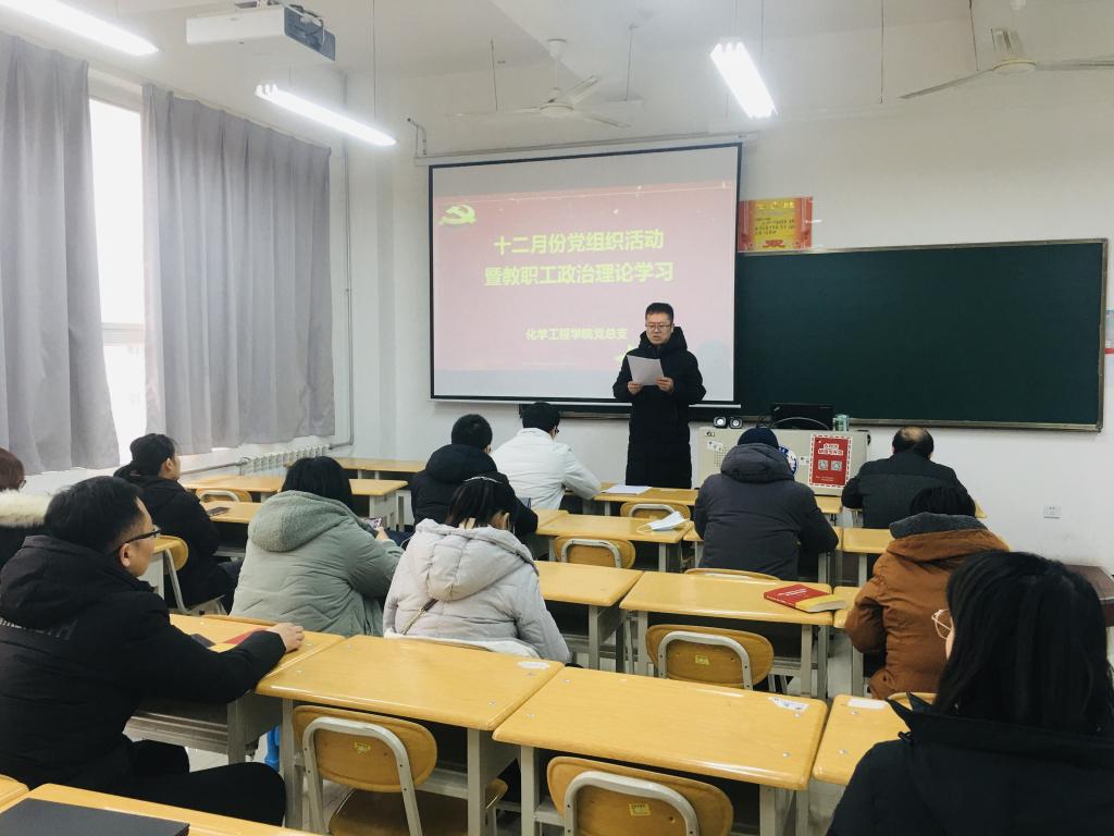 【化工学院党总支】2020年12月17日下午,化工学院党总支在4-440召开12月份政治理论学习会,全体教职工参加了此次学习,会议由党总支书记孟龙主持。孟龙首先带领大家分别学习了习近平总书记关于《中共中央关于制定国民经济和社会发展第十四个五年规划和二〇三五年远景目标的建议》的说明、《中共中央关于制定国民经济和社会发展第十四个五年规划和二〇三五年远景目标的建议》。随后学习了习近平总书记在浦东开发开放 30 周年庆祝大会上的讲话、全国劳动模范和先进工作者表彰大会上的讲等相关内容。孟龙指出:全体教师要认真学习领会本次政治理论学习内容,全面贯彻落实会议精神,大力弘扬劳模精神、劳动精神、工匠精神,以更加饱满的热情和奋发有为的精神状态投入到教育教学工作中去,开拓创新、锐意进取,不断开创化工学院发展新局面。