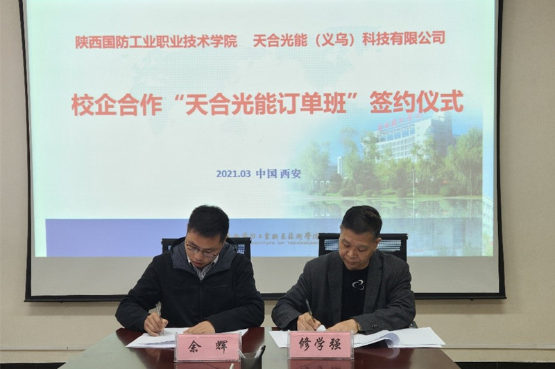 修学强院长与余辉经理代表双方签订了校企合作协议。根据校企合作协议,机械工程学院将从2019级学生中挑选30~50名优秀学生成立“天合光能订单班”,实施校企双元育人。天合光能公司还将设立“天合光能奖学金”,为订单班学生每学期提供数千元奖学金。