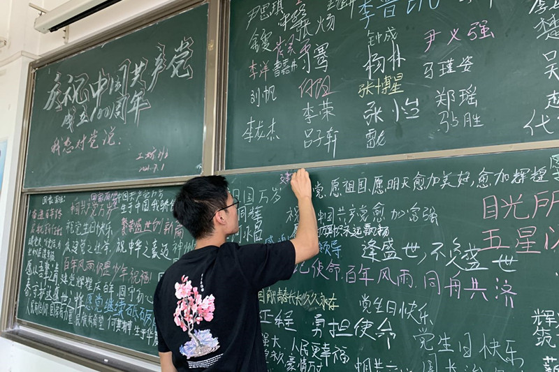 围绕“我想对党说”这个主题,学生们依次走上讲台在黑板上写下了对中国共产党的美好祝福。本次课堂主题实践教学活动是马克思主义学院进一步落实习近平总书记在学校思想政治理论课教师座谈会上重要讲话精神、把党史教育融入思政课教学,推动我院思想政治理论课教学方法改革创新,不断增强思政课的针对性和实效性的重要举措。课后,同学们纷纷表示,王老师今天在中国共产党成立100周年这个特殊的日子里,开展别开生面的课堂实践教学活动,采用同学们喜闻乐见的方式,让学生们用独特的方式表达了对中国共产党的美好祝愿,激发了同学们爱党、爱国、爱人民的热情。通过课堂主题实践教学活动充分发挥了思政课课堂教学的主渠道、主阵地作用,达到了教育引导青年学生坚定永远跟党走的理想信念,厚植爱国情怀的目的。