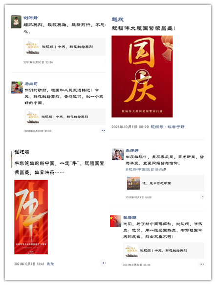 本次活动主要围绕“我向祖国母亲说句话”“请党放心,强国有我”以及“缅怀英烈,致敬英雄”等三个主题。通过开展本次活动,有的教师抒发了自己的爱国情怀;有的教师以个人名义向党、向祖国表决心、表忠心;有的教师致敬革命英烈、赓续红色血脉,砥砺初心使命、汲取奋进力量。