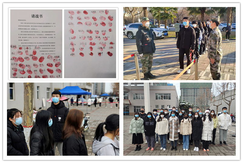 分院退伍老兵、入党积极分子、党员及广大学生主动请缨,签下请战书,组成了200多人的抗疫志愿队伍,字里行间、鲜红的手印无不透露出他们坚决抗疫的决心;学生干部带领班级有序地进行全员核酸检测,为抗击疫情做出贡献。每一位同学都行动起来,一句句“国防加油!西安加油!”震撼人心。